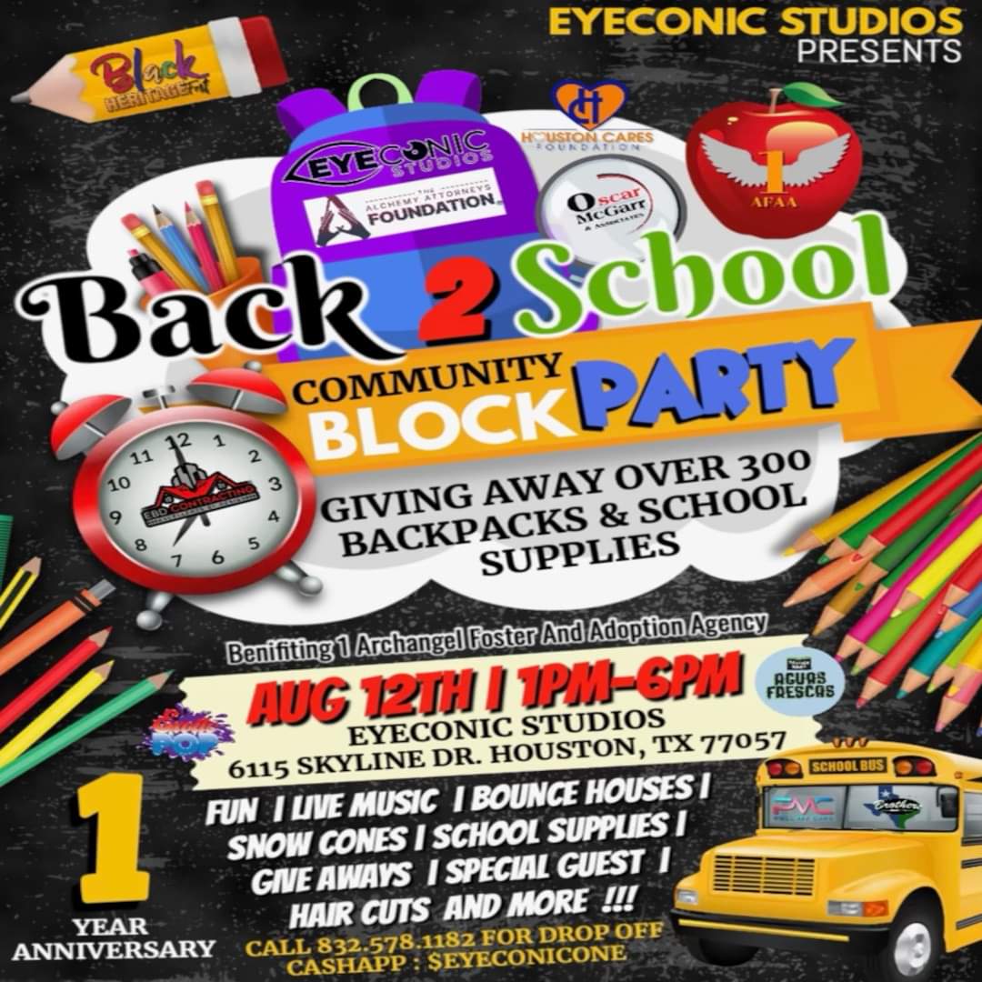 | The school bells are about to ring and we’re gearing up to celebrate the start of a fantastic academic year with a spectacular Back 2 School Block Party! The event benefits the 1 Archangel Foster and Adoption Agency and is cosponsored by the Black Heritage Foundation of which both organizations are founded by our fellow Texas Southern University alums so we need to support them as well as this worthy cause. |